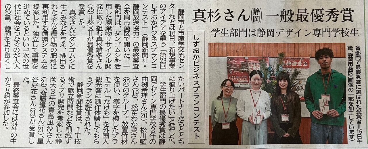 第23回しずおかビジネスプランコンテスト最優秀賞受賞 2026 2/19 未分類 2026年1月9日2026年2月19日 2025年1月16日第23回しずおかビジネスプランコンテストにて、最優秀賞を受賞しました。 未分類 第4回牧之原市チャレンジビジネスコンテスト大賞受賞